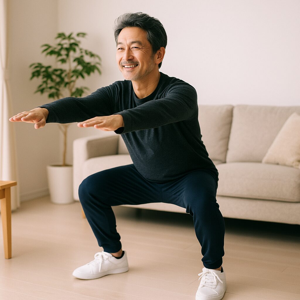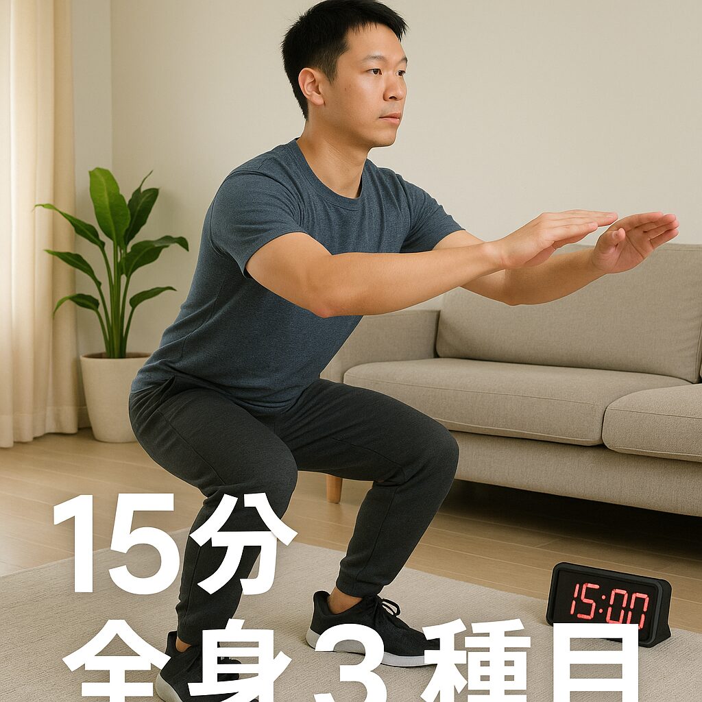 スクワット(下半身と体幹)、腕立て(胸・肩・二の腕)、ヒップヒンジ(背面と臀部)を、呼吸を止めず丁寧に行う。