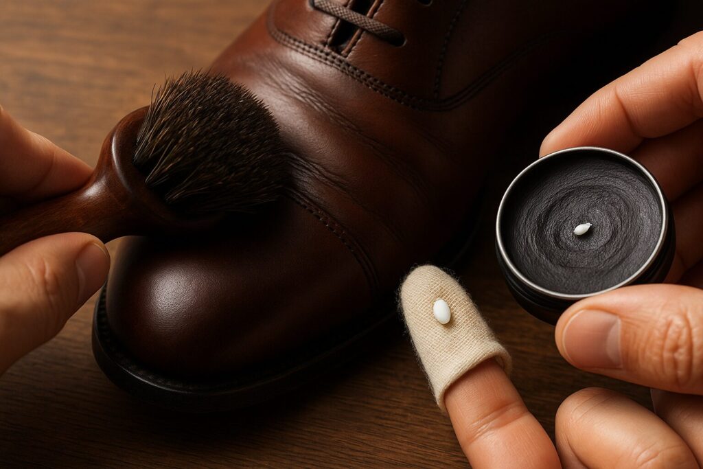 - ワックス(つま先・カカトのみ):米粒1〜2。水一滴で“水研ぎ”感覚に薄く重ねる×2〜3回