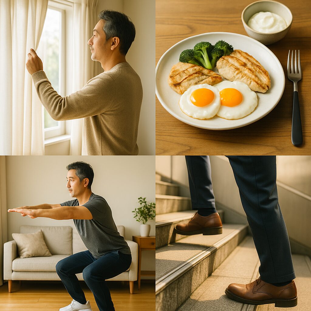 仕事・育児・家事をこなすイケおじパパにとって、体づくりの土台は睡眠だ。筋トレも食事も、回復が伴わなければ成果は出ない。理想は7時間以上だが、忙しい日々では難しい。だからこそ「起床時間の固定」から始める。休日の寝だめはせず、毎朝同じ時間に太陽光を浴び、白湯を一杯。夜は寝る90分前に入浴(40℃で10~15分)して体温を上げ、就寝時に下がるリズムを作る。スマホは就寝1時間前にオフ、代わりにストレッチや読書。枕は低めで呼吸しやすく、寝室は18~20℃・湿度50%を目安に。眠れない日は「無理に寝ない」。ベッドでの格闘を避け、リビングで静かな音楽や日記に切り替える。翌日も起床は固定。睡眠は“量よりリズム”が勝つ。家族の笑顔を守る体力は、まず夜の準備から。