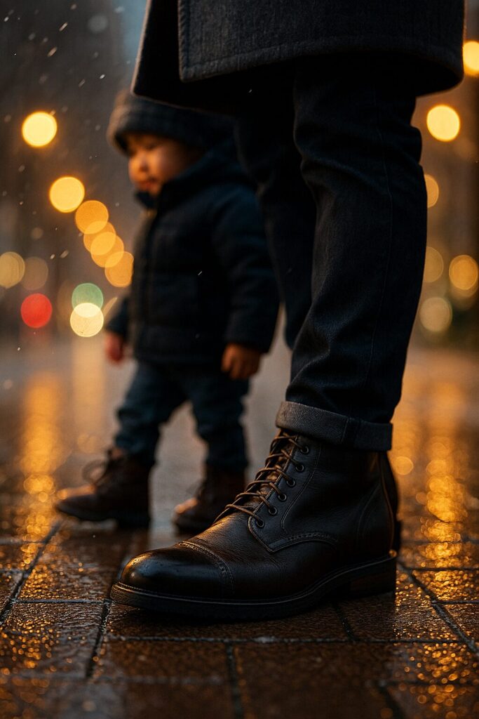 休日の散歩でも、ブーツの光沢が冬の光を受けて輝く。