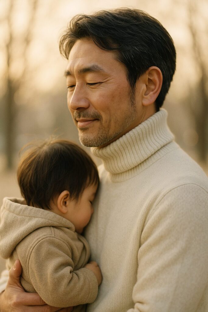 清潔感と優しさを両立できる、まさに冬の父親の定番です。