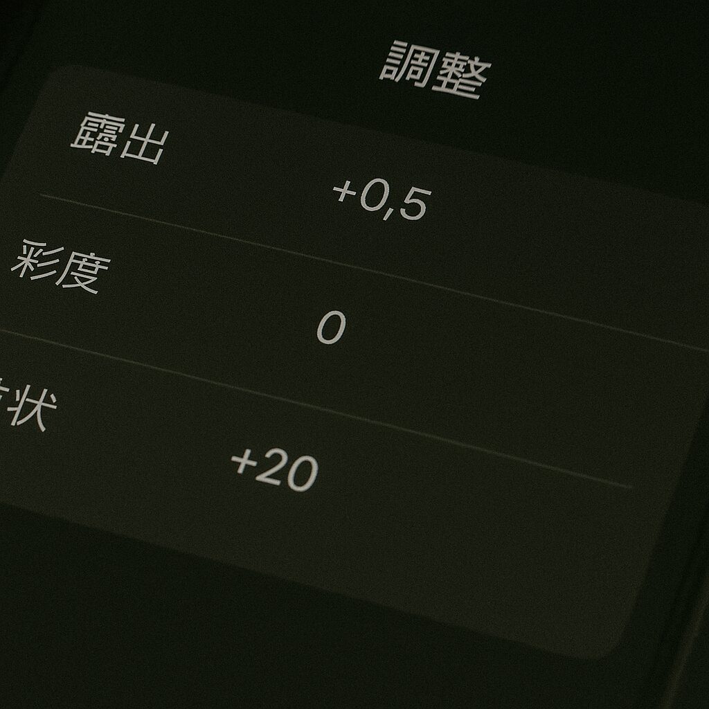 - 技術1行:「露出-0.5/ハイライト-30/粒状12。」