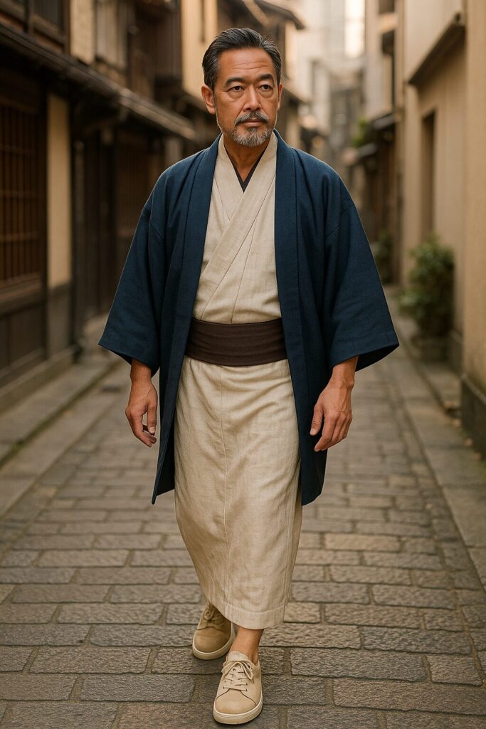 - 生成りベース:生成り着流し+藍羽織+焦茶帯+ベージュスニーカー